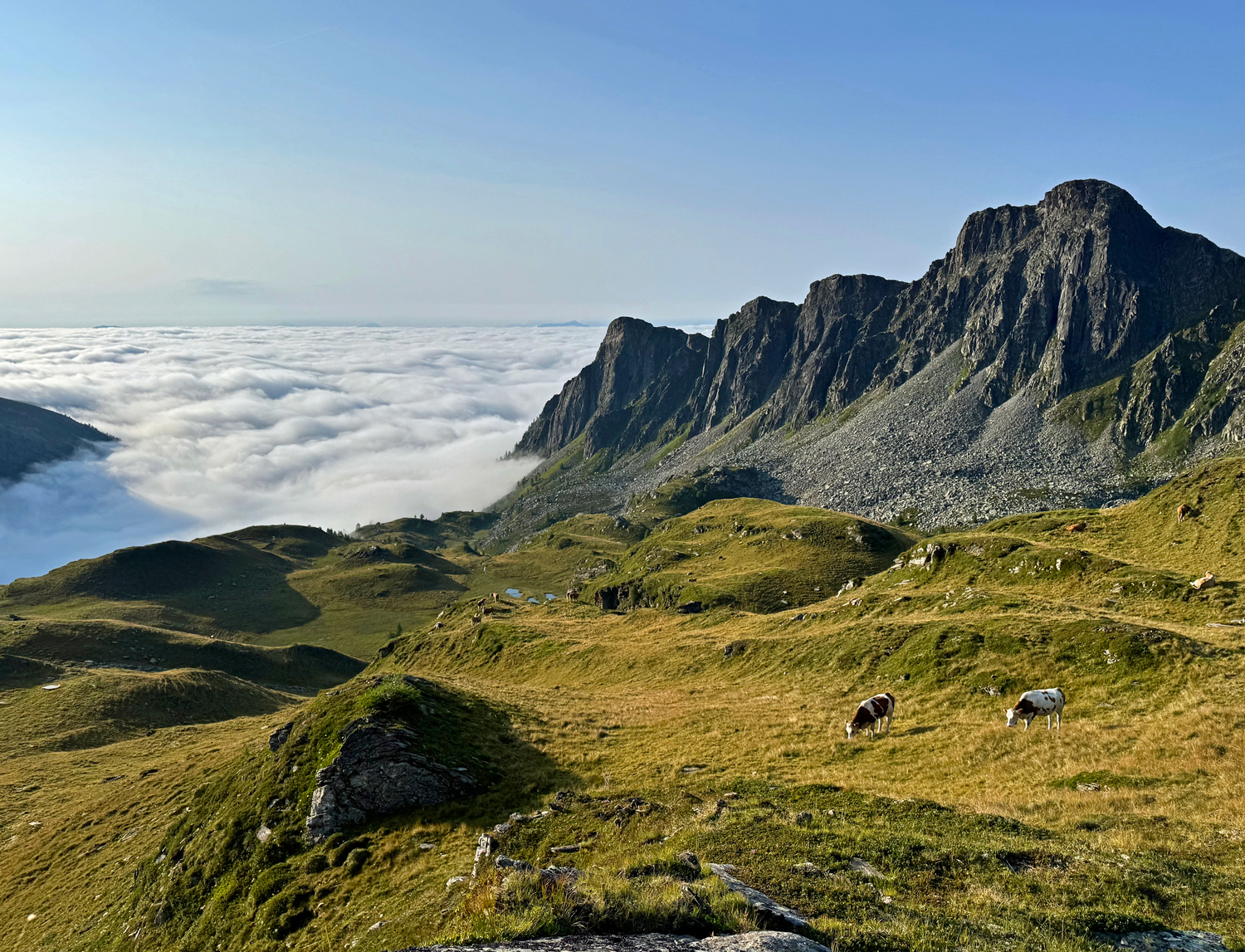 Mitte Oktober bei angenehmer Temperatur auf 3000m ist doch etwas ungewöhnlich. Ich konnte eine schöne Muskovit-Calcit-Quarz Kluft öffnen und an anderen Stellen Pyrit und für diese Gegend für mich neu grosse Rauchquarze finden :-)